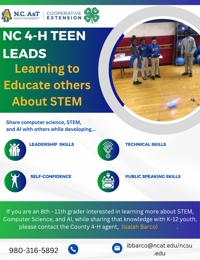 Are you in 8th–11th grade and looking for a chance to grow as a leader while diving into the exciting world of STEM and computer science? The NC 4-H Teen LEADS Program is designed to do just that! Registration is open from October 1st - October 31st, 2025.